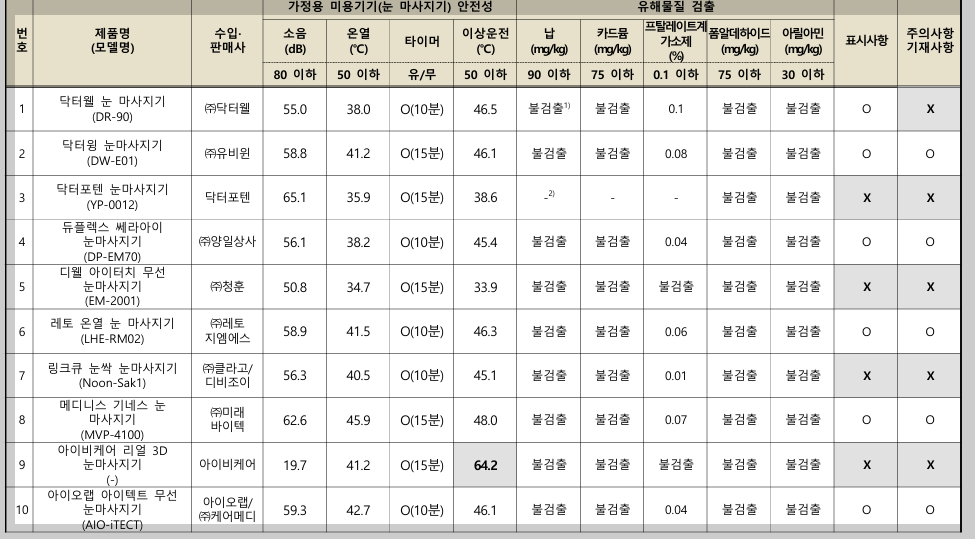 스마트폰과 태블릿 PC 등 휴대전자기기의 빠른 보급으로 눈의 피로를 호소하는 사람들이 증가하고 있습니다. 이와 더불어 눈의 피로를 풀어 줄 수 있는 눈마사지기의 인기도 빠르게 늘고 있습니다. 그러나 눈 마사지기 얼굴에 바로 접촉하여 사용하는 제품인 만큼 화상, 부종, 소음 등의 안전사고에 특별히 유의해야 합니다. 시중에 판매되고 있는 20개 눈마사지기의 안전평가를 공유하고 현명한 소비에 도움을 드리고자 합니다.