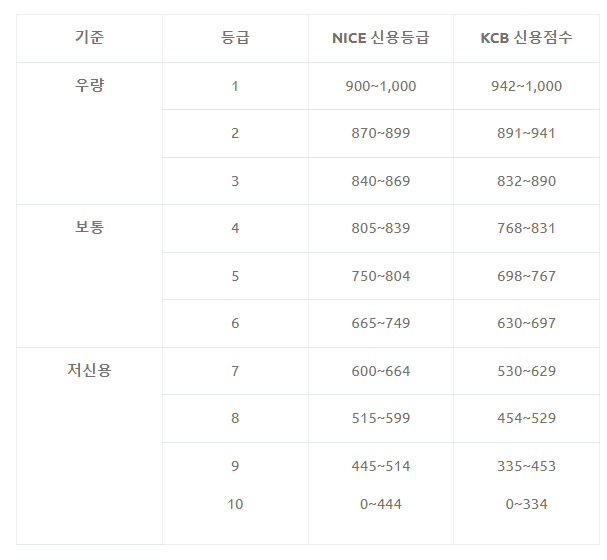 우리가 신용등급이라 부르는 이 제도는 2021년부터 점수제로 바뀌어서 적용되고 있습니다. NICE, KCB에서 기준으로 하는 신용 점수에 따른 등급표를 살펴보면 내 신용이 어느 위치에 있는지 알 수 있습니다.
