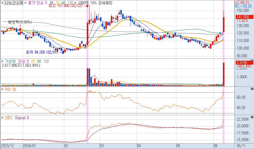 실리콘 음극재 생산기업인 대주전자재료의 주가가 11일 오전 폭등세다.11일 코스닥시장에서 대주전자재료 주가는 오전 10시 5분 현재 전 거래일보다 20.23% 오른 14만 8000원을 기록하고 있다.장중 15