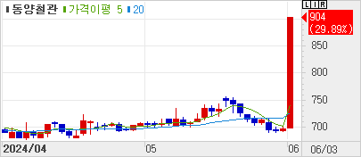 [핀포인트뉴스 최소연 기자] 윤석열 대통령의 동해 석유·가스전의 탐사 시추 계획 승인 소식이 동양철관 주가가 상한가로 치솟았다.3일 한국거래소에 따르면 이날 오후 29.89% 올라 904원에 거래