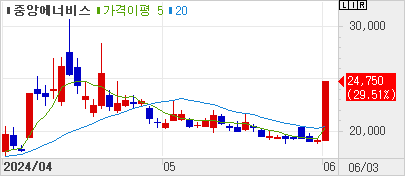 중앙에너비스(+29.51%)   尹 대통령, "동해에 140억 배럴 규모 석유·가스 매장 가능성" 발언 등에 에너지 관련주 상승 속 급등