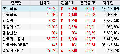 한국석유(29.98%) 1 尹 대통령, "동해에 140억 배럴 규모 석유·가스 매장 가능성" 발언 속 에너지 관련주로 부각되며 상한가