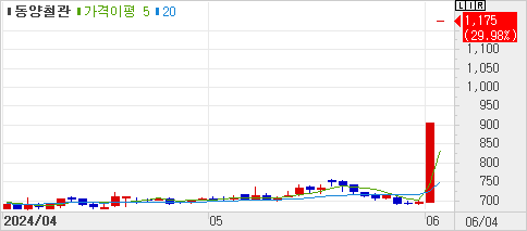 철관 관련주 동양철관이 이틀째 상한가다. 동양철관은 4일 오후 2시5분 기준 유가증권 시장에서 전날대비 271원(29.98%) 오른 1175원에 거래되고 있다. 동양철관...