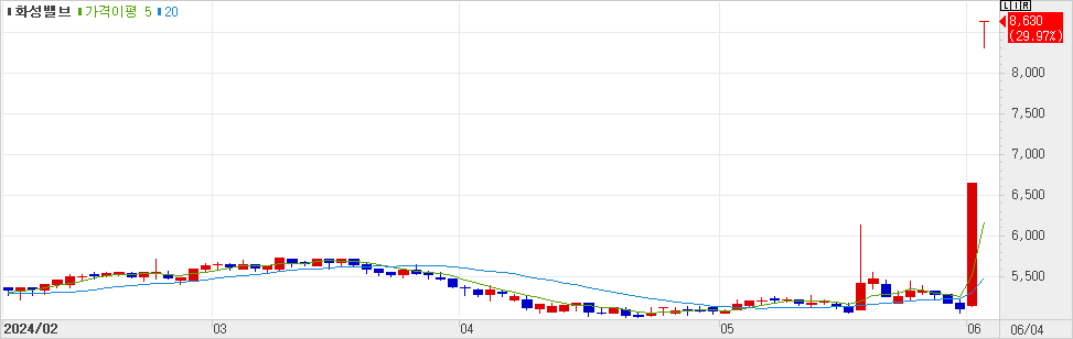 국내 1위 밸브 전문기업. 가스공사 협력사. 6/3 정부 발표 이후 급등. 국내 가스 채굴 현실화되면 인프라 확충에 따른 매출 증대 기대감 상승.