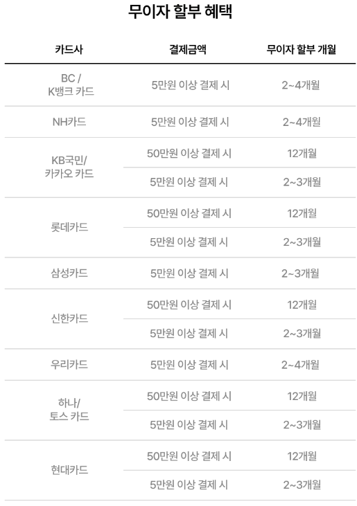 카드별로 2개월부터 최대 12개월까지 무이자 할부 혜택도 받을 수 있습니다. 카드별 무이자 할부 혜택의 자세한 내용은 아래 그림을 확인해 주세요.