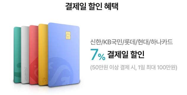 신한카드, 국민카드, 롯데카드, 현대카드, 하나카드로 50만원 이상 결제하시면 결제일에 자동으로 7% 할인을 받으실 수 있습니다.
